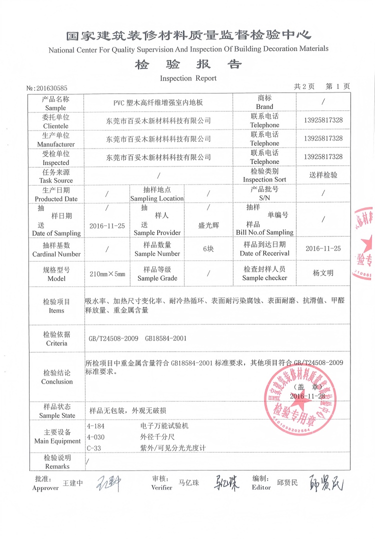 品质是企业的生命线,更是百妥木开拓全球市场的核心底气。为确保产品品质达到国际高端标准,百妥木严格把控生产全流程,从原材料采购到产品出厂,每一个环节都实行精细化管理,同时主动将产品送往国家建筑装修材料质量监督检验中心进行检测,以权威数据证明产品实力。根据国家建筑装修材料质量监督检验中心出具的检验报告(报告编号:201630585)显示,百妥木PVC塑木高纤维增强室内地板的各项性能指标均远超国家标准,全面符合GB/T24508-2009《木塑地板》和GB18584-2001《室内装饰装修材料 木家具中有害物质限量》标准要求,用硬核数据筑牢品质防线。