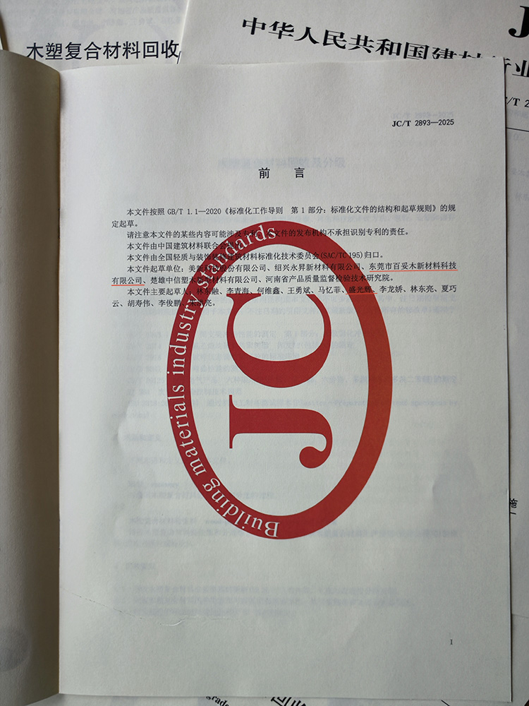 东莞市百妥木新材料科技有限公司本身深耕塑木领域,不仅拥有强大的研发与生产实力,还积极投身行业标准建设,此前已参与《建筑用木塑复合材料挥发性有机化合物(VOC)测定》等国家标准的起草工作,盛光辉盛总作为主要起草人之一,始终以推动行业高质量发展为己任,将企业实践经验转化为行业规范,为木塑行业的标准化、可持续发展注入动力。