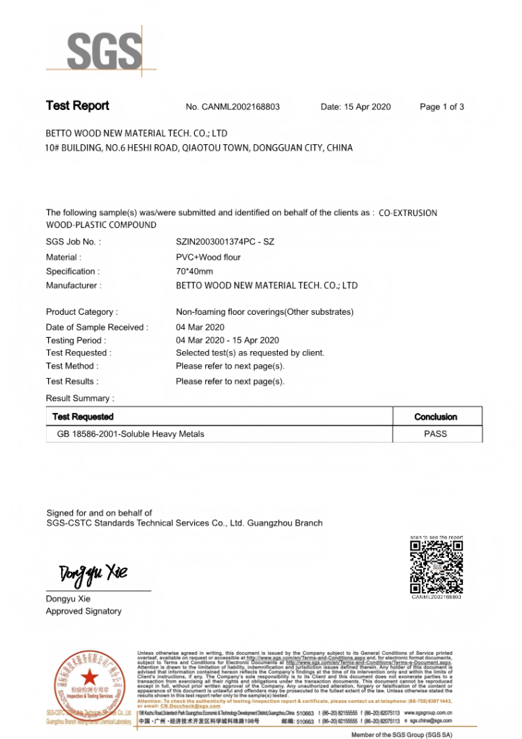 在全球高端塑木材料市场中,百妥木作为专注高端塑木研发、生产与出口的领军品牌,始终以“品质为先、合规至上”为核心原则,产品远销欧美、英国、日本、韩国、德国、俄罗斯、法国、意大利、加拿大、澳大利亚、西班牙、荷兰、智利、卡塔尔等30多个国家和地区,深受全球客户的信赖与认可。可溶性重金属含量作为塑木材料安全性的核心指标,直接关系到人体健康、环境安全以及产品的国际市场准入资格,百妥木对此高度重视,主动委托全球权威检测机构SGS开展可溶性重金属专项测试,以严苛标准践行品牌承诺,用专业检测证明产品实力。