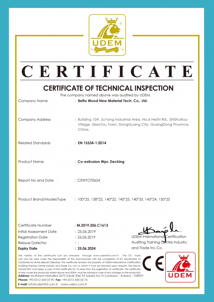 作为专注高端塑木材料研发、生产与出口的企业,百妥木深知CE认证对出口欧盟的重要性,自布局欧盟市场之初,便将合规理念融入企业发展的每一个环节,主动对接国际权威认证机构,启动CE认证审核工作。不同于行业内部分企业“为认证而认证”的敷衍态度,百妥木从原材料采购环节就严格对标EN 15534-1:2014标准,选用环保级原材料,杜绝有害成分添加,从源头保障产品的合规性与安全性。同时,企业优化生产流程,引入先进的生产设备与检测体系,确保每一批产品都能达到欧盟标准,最终顺利通过UDEM国际认证审计培训中心的严格审核,获得CE技术检验证书(证书编号:M.2019.206.C1613)。