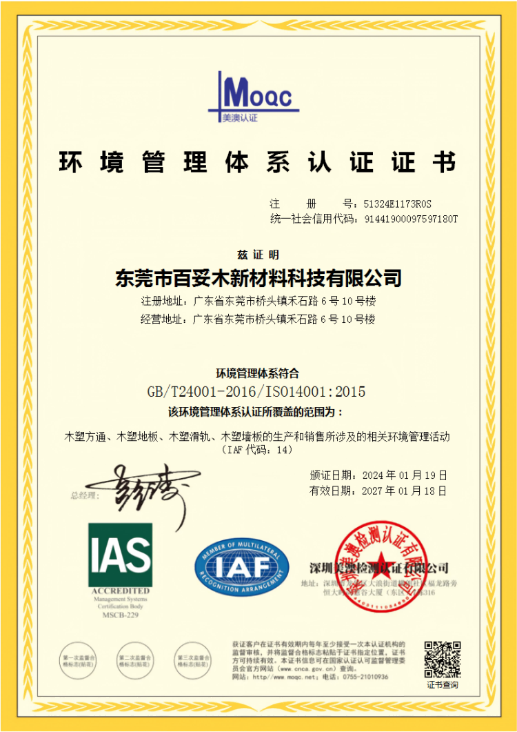 据悉,该环境管理体系认证覆盖百妥木全系列核心产品的生产和销售相关环境管理活动,具体包括木塑方通、木塑地板、木塑滑轨、木塑墙板四大主力产品(IAF代码:14),认证有效期至2027年01月18日,期间每年将接受认证机构的监督审核,确保企业环境管理体系持续合规、高效运行。作为国家认证认可监督管理委员会官方网站可查询的正规认证企业,百妥木的每一项生产活动都严格遵循国际环保标准,从原材料采购到生产加工,从成品检测到包装运输,全程实现绿色管控,杜绝环境污染,真正做到“生产环保化、产品绿色化”。