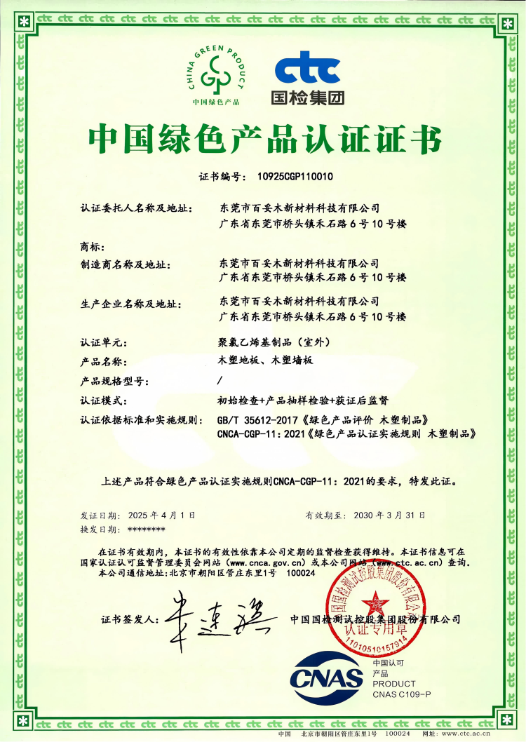 在全球绿色低碳浪潮席卷之下,环保、健康、可持续已成为建材行业的核心发展趋势,更是高端塑木材料市场的核心竞争力。作为深耕高端塑木领域的领军企业,东莞市百妥木新材料科技有限公司(以下简称“百妥木”)再添重磅荣誉——旗下塑木地板、塑木墙板(聚氯乙烯基室外制品)成功通过国家绿色产品认证,斩获由中国国检测试控股集团股份有限公司颁发的认证证书(证书编号:10925CGP110010),这不仅是对百妥木产品环保品质与生产实力的权威认可,更标志着其在高端塑木领域的绿色发展之路迈出坚实一步,为行业树立了绿色标杆。